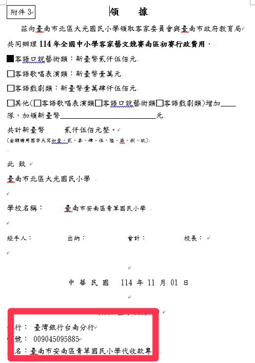 為確保能順利核撥行政費至各參賽學校,請務必於領據填寫學校統一編號,以便承辦單位核銷作業。